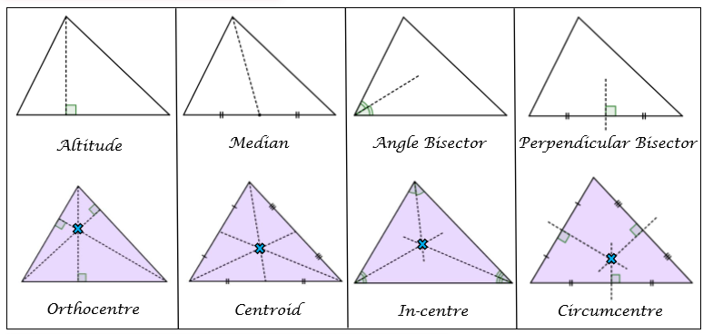 四心 (Four Centres) 包括外心(Circumcentre)、形心 (Centroid)、內心( Incentre )和垂心 (Orthocentre)。
