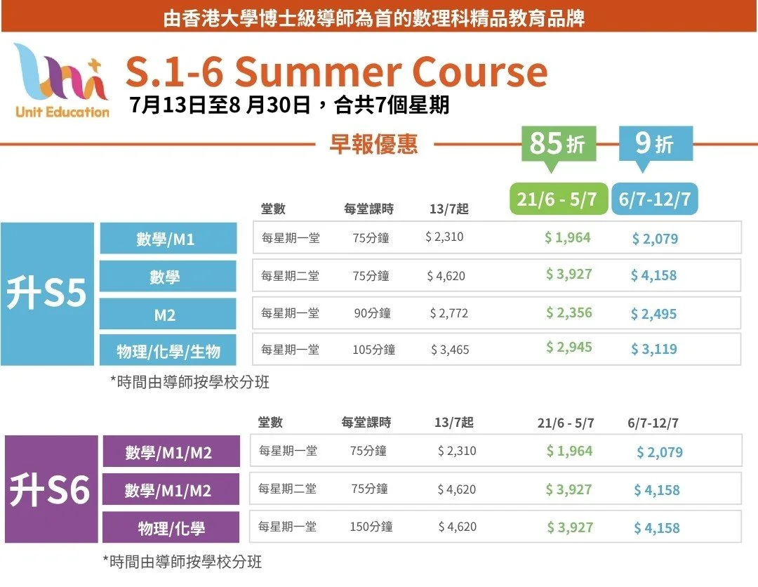 升讀S6暑期班有提供 物理,化學,數學,M1,M2,