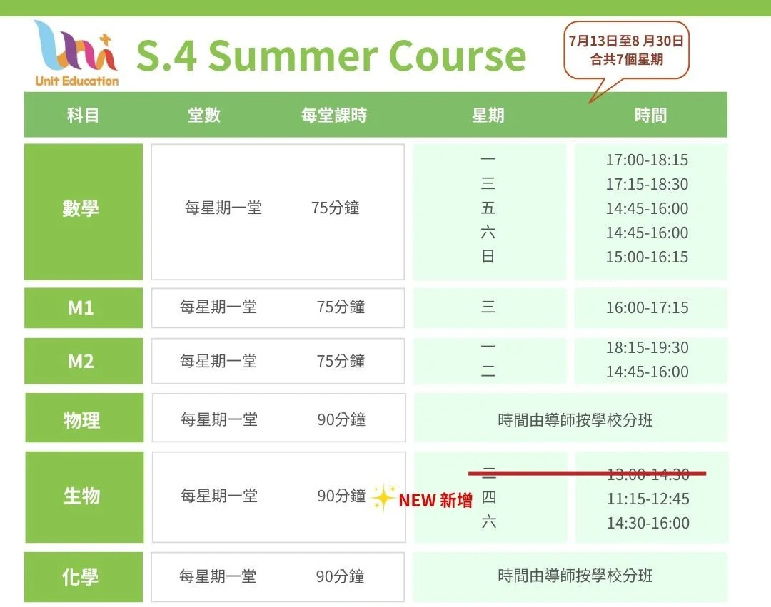 升讀S3暑期班有提供物理,化學,生物(中/英生物課程),數學。